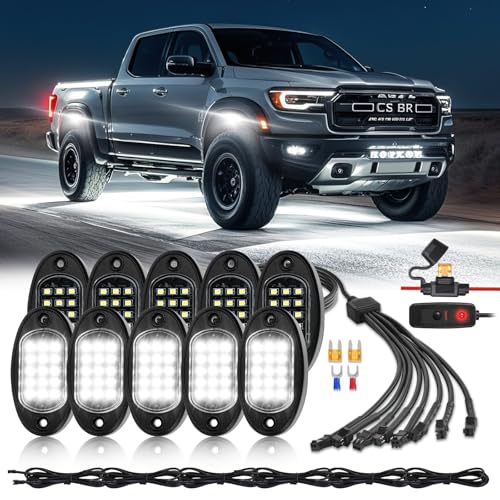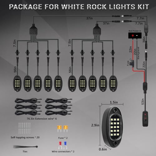 EASY TO INSTALL DESIGN: Pure white rock light with convenient wiring connector (splitter), eliminates complex wiring to mak installation process easier. Equipped with a power switch to turn on or off light at any time, to prevent unnecessary battery drain (built-in 5A fuse). Additionally, 4pcs 78.74 IN extension cords are provided for longer distance installation in truck. With self-tapping screws, tie wraps, heat shrink wire connectors, fuses, ect tools to make your installation even easier.