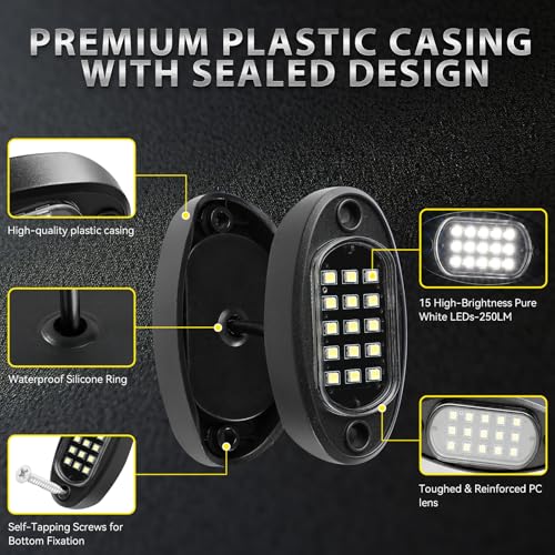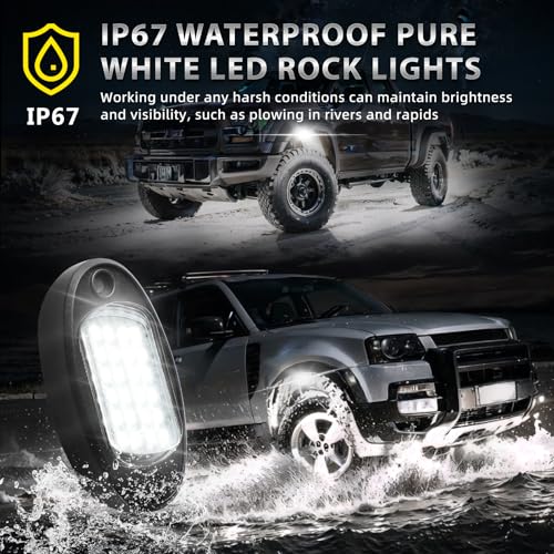 IP67 WATERPROOF: Pure white truck rock light housing is made of high quality ABS plastic, more even lighting, Lightweight, long service life, fully sealed design with waterproof silicone prevents dust, sand, soil, and water from getting in, no need to worry about rain, mud, off-road, snow, or other harsh environments when you are driving outdoors.