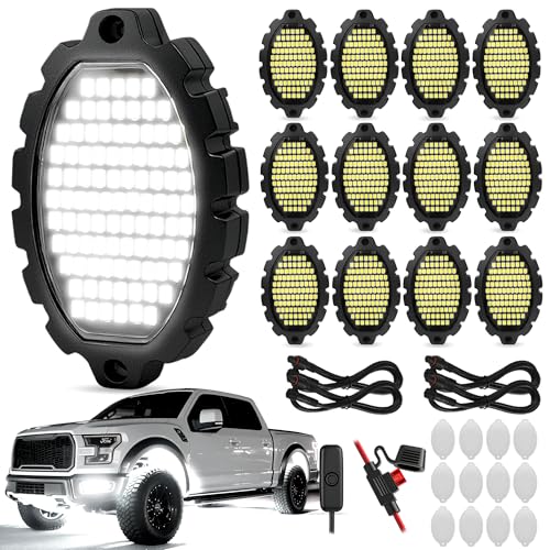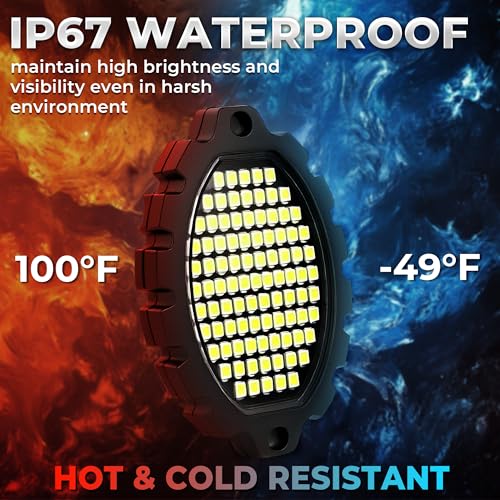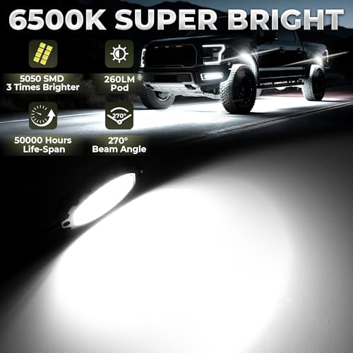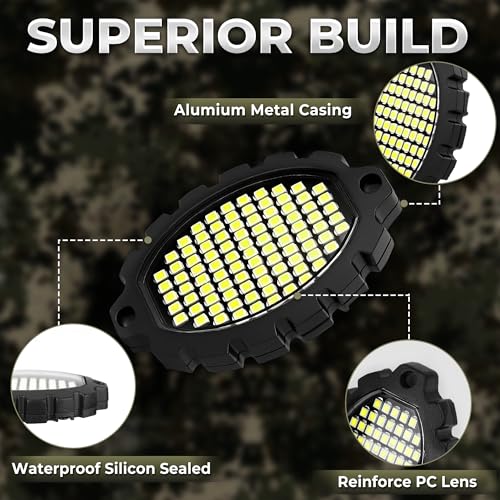 ?93 LEDs/Pod Ultra Bright Output?Each pod is fitted with 93 high-intensity SMD 5050 LED chips, totaling 1116 LEDs for the full set. These pure white alloy rock lights for trucks emit 3x brighter illumination with an ultra-wide beam, delivering unmatched clarity to light up every corner. Ideal for off-road adventures, they ensure excellent visibility even in dark, rugged terrains