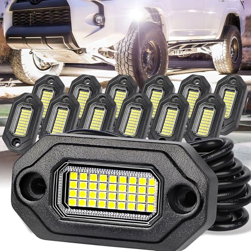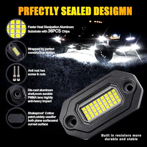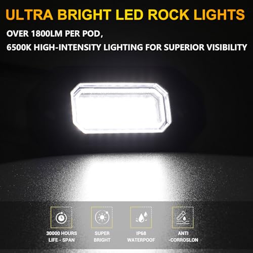 ?6500K Pure White LED Excellence?Super bright 6500K Pure White LED Rock Lights, each light has a 15ft/4.5m cord length, long enough for any transportation installation. Each light is equipped with 36pcs high brightness LED chips that emit a longer and wider beam. These lights are perfect for improving visibility at night, in fog, rain, or on poorly lit roads, enhancing your driving safety and aesthetics, ensuring your nighttime driving is brighter and more enjoyable.