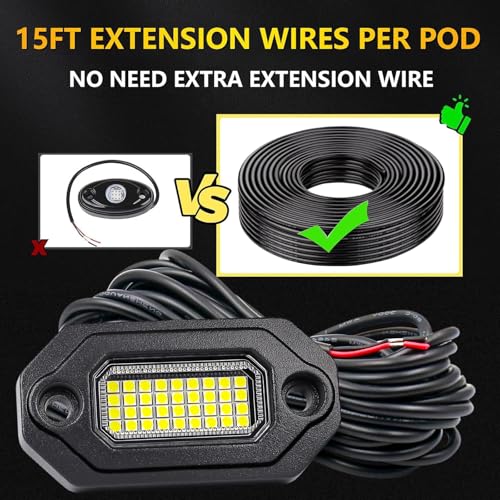 ?Effortless Installation? Each rock light comes with a 15-foot extension cord. flexible spacing and seamless setup, NO NEED extra extension wire. Rock lights for Trucks UTV ATV RZR, vans, off-road, car, motorcycle, boats, etc (12-24V).