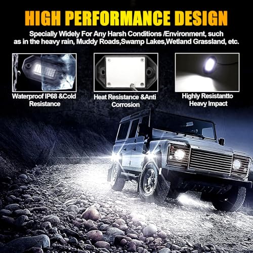 ?Universal Fit for Diverse Applications?Designed for compatibility with a wide range of vehicles, including cars, trucks, off-roaders, boats, ATVs, SUVs, UTVs, motorcycles, golf carts, and station wagons, our rock lights offer unparalleled versatility. Install them on your front grill, tires, undercarriage, boat deck, or any other desired location to add a touch of style and enhance visibility.
