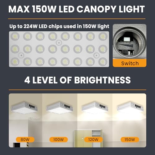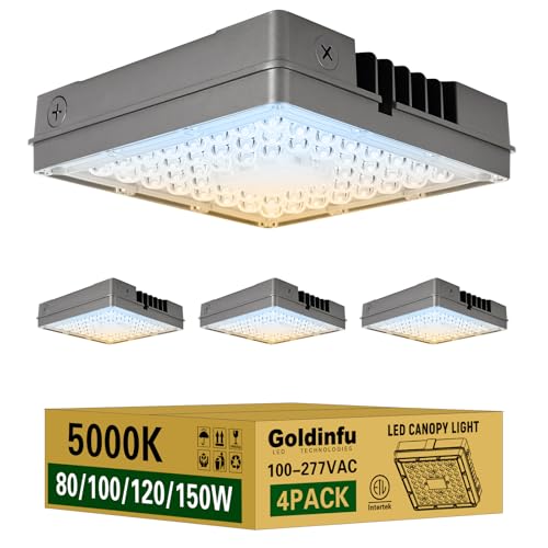 High Efficient & Multi wattages : Goldinfu 150w led canopy light provide super brightness 22500lm,with versatile wattage settings (80W, 100W,120W,150W). Our LED Canopy Lighting allows you to customize the light intensity and ambiance. Larger lighting surface and high efficient output led canopy lights outdoor. Goldinfu Gas Station Celing Light is perfect for various applications like Garages, Shops, Gas Staions, Carports, Warehouses etc.