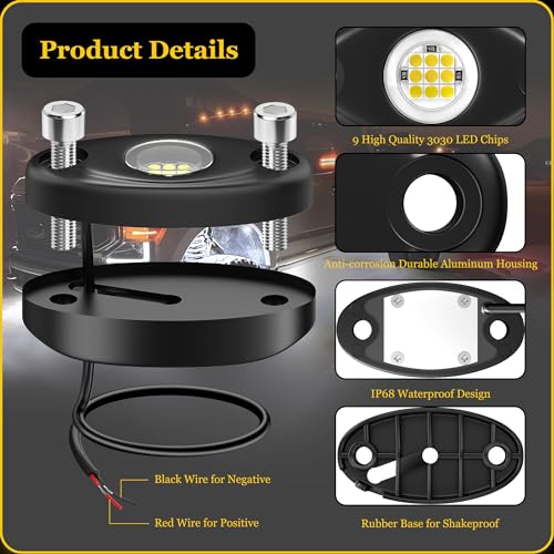 Versatile Application: Ideal for off-road enthusiasts, these rock lights are versatile and can be used on trucks, cars, SUVs, ATVs, Golf Carts, and other outdoor vehicles to add a stylish and functional lighting element.