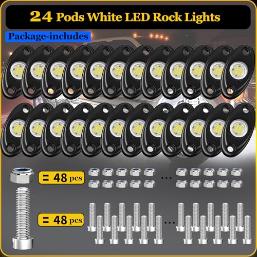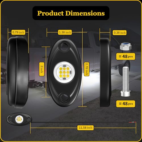 Package Includes: Each package includes 24 pods lights and 48 sets of screws and nuts, compatible with 9-16 V DC voltage. At approximately 2.78*1.38 inches per pod, and the wire is 11.58 inches in length, they provide enhanced visibility for nighttime driving. Easy installation ensures quick setup, illuminating your journey with comfort and safety.