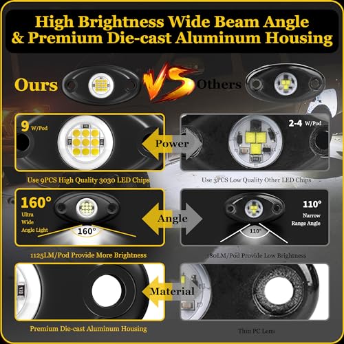 Durable Construction: Built with die-cast aluminum, these rock lights feature a robust design to withstand tough off-road conditions and environmental elements.