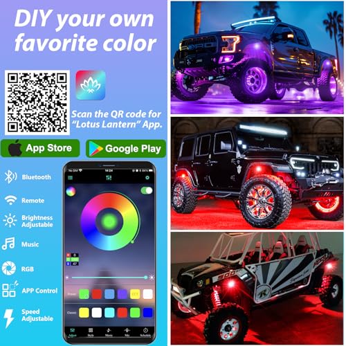 ?APP Control ?Car underglow kit supports APP control, bluetooth controls and timed RGB rock lights are compatible with iOS or Android, You can set the timing mode, music mode, flash mode, automatic mode through the mobile phone, Music mode allows you to control the flash frequency of the light box based on the music you play, and it remembers the last time it was off, No need to reset the mode the next time you open it, allowing you to enjoy the moving light show.