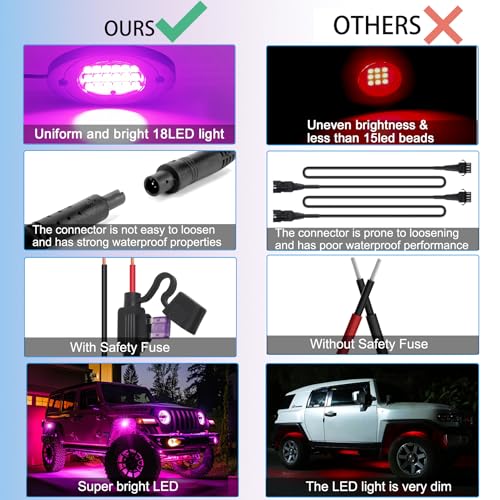 ?Brake Warning Function & Water Resistance?Ultra-safe design, when braking, all lights will synchronize with the brake light red, for your safety escort. Made of ABS high quality material, these wheel lights for cars are designed to withstand the rigors of off-road adventures, ensuring and reliable performance in harsh environments. With an IP68 superior waterproof rating, you can rest assured with these truck-ready underside light kits for rain, dirt, snow adventures. Each set of rock lights is equipped with safety fuses to prevent leakage and short circuits, and automatically cuts power to protect your vehicle's when a fault occurs.