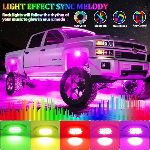 ?RGB Multi-Color & Music Mode?The RGB LED rock lights are Intelligent driver chip, which allows better control of light intensity and rhythm, 18 SMD Lamp bead provides brighter lighting and low energy consumption?rock lights for trucks With multicolor to choose from, You can customize 16 million RGB colors, the RGB Rock Light Kit will glow to the rhythm of your music, including slow, relaxing music,This creates a unique Lighting atmosphere.