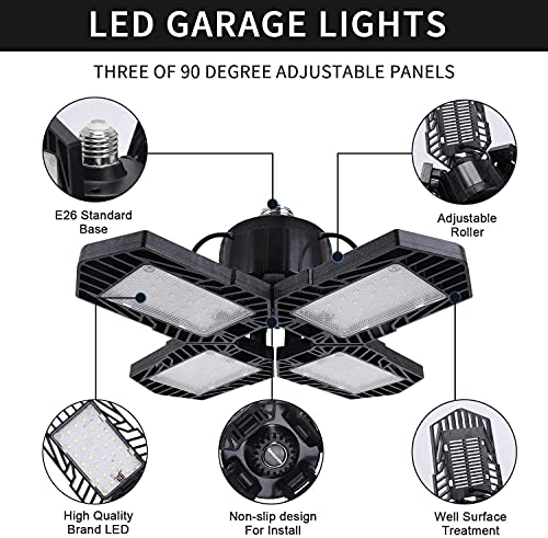 ?Deformable Design?Garage Lights 100W have 4 LED panels heads can be adjusted, each light head can be folded up to 90°. The maximum coverage angle can reach 180°, This will make the light cover a wide area.The lighting is adjustable so that you can angle the LEDs to shine where you want them