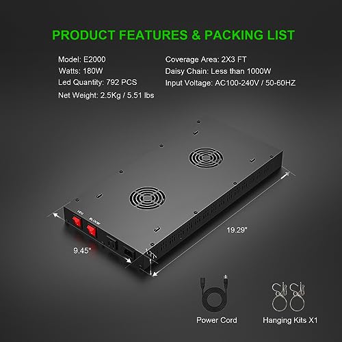 ?High Yield & Low Power Consumption?Our led grow lights feature 792 high-quality LED beads, boasting an impressive energy efficiency of 2.7 ?mol/J. The light's above is made of acrylic glass, which enhances light penetration and overall efficiency. Compared to traditional HPS lights, you can save up to 60% on electricity bills, as our E2000 LED grow light is equivalent to a powerful 720W HPS light while consuming only 180W!