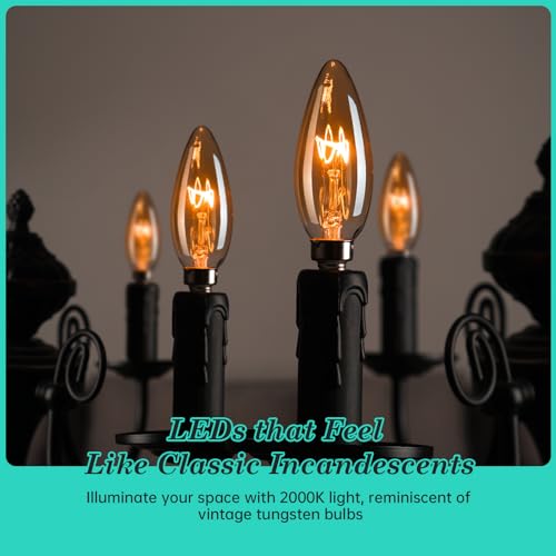 Ultra-Thin LED Filament: Embrace the warmth of yesteryear with our E12 candelabra bulb 20 watts 25 watts; Within the amber-hued glass shell, these LED chandelier lights E12 20 watts 25 watts feature the thinnest LED filaments on the market, casting a nostalgic glow at a cozy 2000K color temperature; It's a modern twist on the classic incandescent, designed to stir the memory and illuminate the home