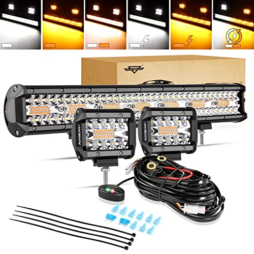 Super Brightness - Auxbeam led light bar with high intensity LED chips,super cool engineering spot flood combo beam pattern design. Amber lights has strong penetration and white lights offer bright illumination, great as warning light, fog lights, driving lights or work lights.