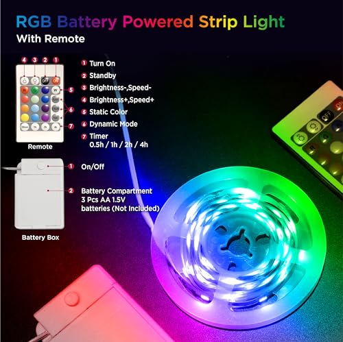 LED Strip Lights Battery Powered with Remote Control - With the included 24-key remote control, you can easily switch between 13 static colors and 3 color changing dynamic modes, as well as choose from a wide range of colors to set the perfect mood for your bike, skateboard, party, computer, TV, etc.