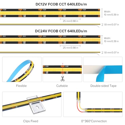 ?Tunable Color Temperature 2700K-6500K?DC12V 2X16.4FT Totally 32.8FT 640LED/m Black PCB.Achieve the perfect lighting ambiance with our COB CCT adjustable LED strip lights. Smoothly transition from warm, cozy white (2700K) to bright, crisp daylight (6500K) to match your mood or decor.Compatible with standard CCT dimmers (sold separately), these lights allow independent control of brightness and color temperature.Such as: WB5,RC02RFB+C02RF,C02W,SP630E etc.