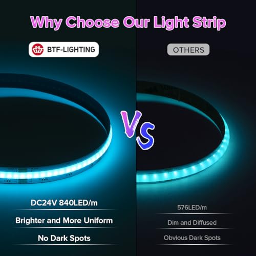 ?Ultra Bright and Uniform?2 Pack 16.4FT DC12V 840LED/m COB RGB LED Strip.Flip Chip On Board(FCOB). Adopting high brightness LED as the light source to ensure the brightness while maintaining color consistency.Compared with traditional 5050SMD RGB 3528SMD RGB light strips, FCOB light strips dense light-emitting units create a brighter, softer, and more uniform light, avoiding black in the middle area.