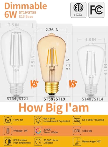 2700K Amber Glow - ST58 (ST19) vintage edison bulb, light pattern same as incandescent bulbs, covered with the gilded glass, 2700K color temperature bulbs produce extremely warm and deep tones, dominated by rich orange and red, create a visual effect close to candlelight, bonfire or sunset, 360 degrees beam angle, less heat and instant on