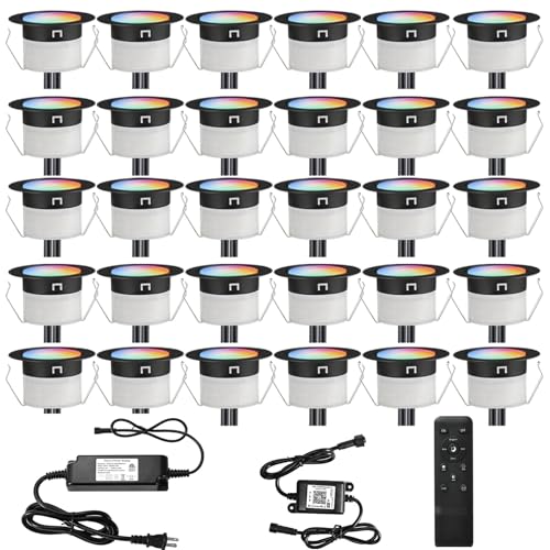 ? RGB + Warm White -- Choose the perfect mode according to your diverse needs. Colorful lights adding based on high bright warm white, good user experience. Great outdoor security night light for wall, patio, garden, porch, lawn, pathway, stairway, driveway, etc. ? Upgrade Design -- Alexa (Echo) Compatible, if you are in a WIFI environment, control your LED deck lighting by voice with Alexa. It accepts commands like "Turn on / off, change color, dim / brighten light". ? Light Dimension -- Light Size: ?1.22" x H0.73". Mount Hole Size: ?0.94". Cable Length: 1.64ft (Per Light). Distance Between Light to Light: 3.28ft. if you want to extend it, please purchase our 5pin extension cables separately. If you want the BIG version of these lights (D45), you could search ASIN "B07XPS2KM3" to order them. Search ASIN B077QZHZM8 in Amazon if you want to buy Extension Cables, please choose size 5 Pin. ? Waterproof -- The lights and cables are IP67 waterproof and safe for indoor and outdoor use. With cable attached by male and female waterproof connectors. This kind of LED deck light is made of superb stainless steel and PC fire-proof material so that it is durable. ? Multifunctional LED Recessed Inground Light -- You can adjust the brightness, color and blinking speed of the lights via controller or app, 16 million colors, adapt to music, adjustable brightness, timer function.