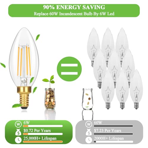 ?Ultra-Bright & Energy-Saving—Less Power, 100% Brightness!?Say goodbye to sky-high electricity bills! Our LED candelabra bulbs deliver the same full brightness as a traditional 60W incandescent bulb while consuming only 6W—instantly cutting your energy bills by up to ninety percent. With 630 lumens of powerful, flicker-free light, you can brighten up your home for hours without worrying about energy waste. Plus, their 25,000-hour lifespan means fewer replacements, long-term savings, and a more sustainable lifestyle