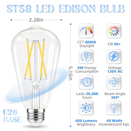 Energy-Efficient Brightness: Our 6W LED Edison bulb delivers 600 lumens of light, equivalent to a 60W incandescent bulb, while using 90% less energy.