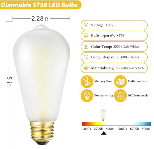 ?Energy Efficient?: These frosted vintage LED bulbs are highly energy-efficient, using only 6W of power while producing the same amount of light as a 60W incandescent bulb, saving you money on electricity bills and reducing your carbon footprint. Average 25000+ hours lifespan for the Dimmable Vintage LED Edison Bulb.