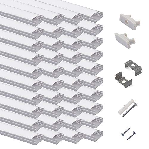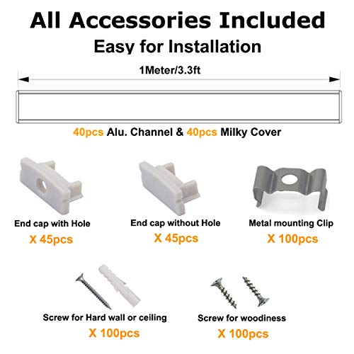 PACKING INCLUDING: Pack of Forty(40) 1m/3.3ft long segments with Cover. Includes 90pcs end caps(45pcs without hole and 45pcs with hole), 100pcs mounting clips, and 200pcs screws(100pcs for woodiness ,100pcs for ceiling) for easy installation. The channels can be cut down to any length. Please search B07886RKNV If need extra mounting clips and end caps. LED strips not including.