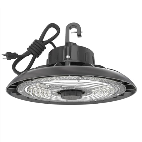 3 Minutes Quick Installation: Hyperlite high bay led shop lights Comes with 5ft power cord with 110V US plug, G-shaped hanging hook and safety cable. No need to worry about installation, you can easily install it in 3 minutes. The standard 3-pin plug design can save you the trouble of wiring. Equipped with a safety cable to provide double protection for the lamp, making it more stable and safe.