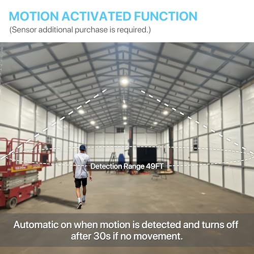 Motion Activated Function?Hyperlite high bay light is equipped with a motion sensor and remote control function. The motion sensor is pre-set to activate the lights for 30 seconds upon detecting movement, such as people, vehicles, or opening garage doors. If no movement is detected, the ufo lights will automatically turn off after 30 seconds. This feature is extremely convenient and saves time, allowing you to control the lights without having to manually flip a switch.
