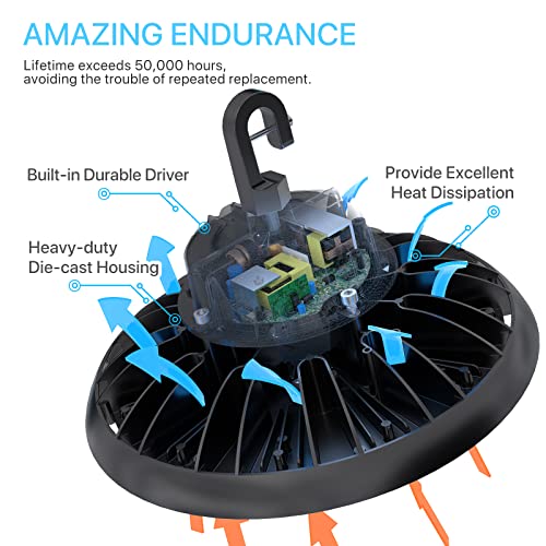 Excellent Heat Dissipation: Hyperlite UFO LED high bay light is made of aluminum, with die-casting technology, and has excellent heat dissipation performance. It has a built-in durable driver, supports AC120-277V voltage, and can be used in various places. With a service life of more than 50,000 hours, you will save replacement costs.