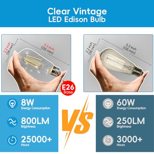Excellent Edison E26 LED bulb: Our LED Edison bulbs adopts famous brand LED filament Light, 8W can replace 60W to 80W incandescent Vintage light bulbs. Our E26 Edison LED bulb 5000K provides more than 20,000 hours of service life, powerfully saves up to 90% of energy consumption, and reduces the frequency and cost of replacing bulbs. Make your life more convenient.