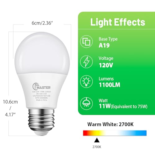 ?????Excellent Color?This pack comes with 6 bulbs, each with 1100 lumens of light output. Our light bulbs can offer you vivid color and fit any mood and decor with CRI85+ and 2700K Warm White.