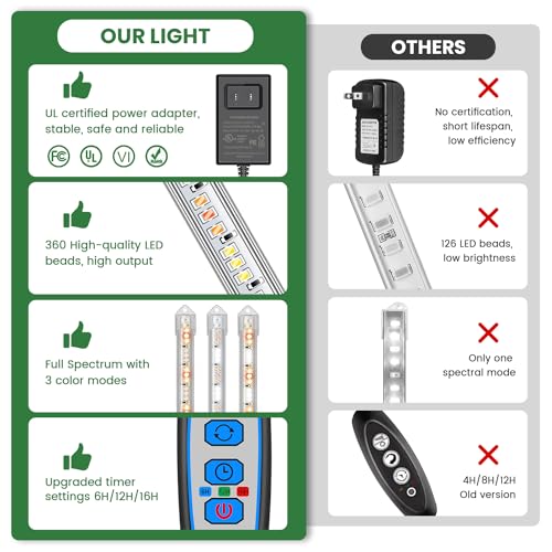 ??6/12/16Hrs Timer & 5 Dimmable Settings?The plant grow light has been upgraded to 6/12/16 hours to ensure the plants have enough time to do photosynthesis to grow faster and better. It will Auto ON/OFF every day, with no need for more manual operation. And it features five adjustable brightness modes, allowing you to customize the lighting to your plants' specific needs.