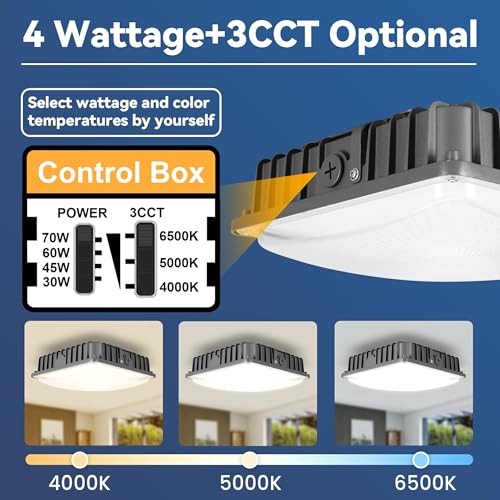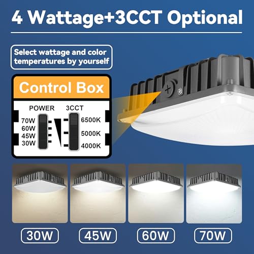 ?2025 New Multi wattages and colors in 1 Light ?Singcenwon LED Canopy Light with 4 wattage settings (30W, 45W, 60W, 70W) and 3 color temperature options (4000K, 5000K, 6500K). 150° beam angle and 350ft wide coverage, commerical canopy LED Lights is widely applicable to Garages,Shops,Gas Stations,Carports,Warehouses,porch, Entrances etc.