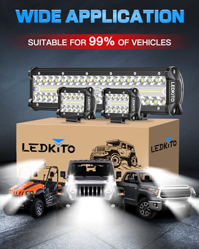 ?Wide Application?LEDKITO 12 Inch Off Road LED Light Bar and 2PCS 4 inch LED Light Pods Kit Suitable for Je-ep,Various Off Road,SUV,ATV,UTV,Trucks,Boat,Golf Cart,Tractor,Van,Side by Side with DC 12V Power Supply.The 12 Inch LED Bar Light & 4 Inch Pod Lights Kit is Perfect to Be Used As Off Road Light,Work Light,Fog Light,Driving Light, etc.