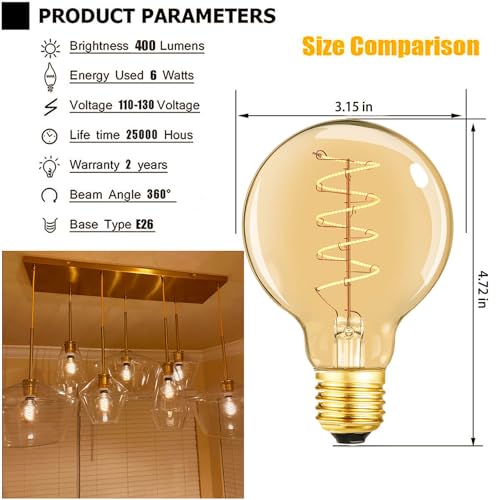 VINTAGE STYLE - This vintage filament bulb preserves the design of traditional Edison light bulbs but with LED, amber warm (2200K) color energy saving technology,e26 led globe edison bulb G25(G80) with spiral led filament, Amber glass, create to classic atmosphere, fantastic for decorative lighting, standard (Medium) base E26 fit all home lighting fixture.