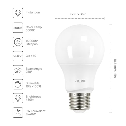 ?MONEY SAVING & LONG LASTING: Linkind A19 LED light bulbs can last for at least 13 years based on 3hrs/day of use. It provides up to 85% energy saving by replacing 40W with 5W. Replace your old incandescent bulbs for a brighter and more energy friendly home.