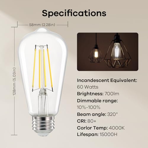 ?Smooth Dimming & Flicker Free? Linkind ST58 edison dimmable led light bulbs have smooth dimming range from 10%-100% without any buzz or flickering, helping you to set any brightness you prefer. Giving off 700 lumens of light output, they are super bright to light up every dark corner and create a cosy, neat atmosphere for relaxation with 4000K cool white light. (Used with Dimmer)