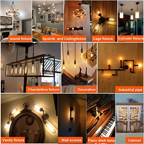?Smooth Dimmable&Skinny&Long?:5Inch long E26 edison bulb is smooth dimming 0%-100%,tested compatible with 95% Lutron,Leviton and Eaton dimmers,Such as Lutron Skylark,Davi,Toggler,Caseta,Maestro,Rotary Preset Dimmer,Leviton and Eaton SAL06P,etc;Narrow retro e26 light bulb suitable for most light fixture with medium E26 socket,especially for fixtures with light bulbs in rustic Pendant,Chandeliers,Sputnik,Island,Wall scones,Vanity,Cabinet,Industrial pipe fixture,piano desk lamp,etc.