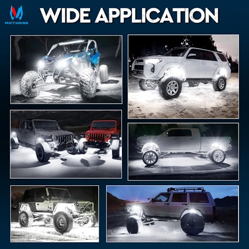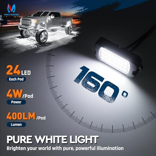 ??Product Philosophy?At MICTUNING, we blend "reliable, innovative, fun" into every product. The Q1 MAX White Rock Lights are designed for drivers, truck owners, off-roaders, and boat enthusiasts. We understand the frustration of dealing with dim, mixed-color lighting. That's why we've engineered these lights to deliver pure white illumination and high brightness, ensuring you can navigate confidently anywhere