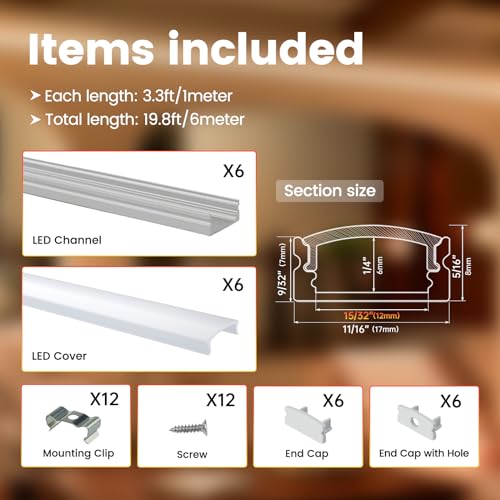 Effortless Installation - The LED covers can be simply pressed into channels. Check out the video on this page for more detailed installation steps. They can be cut into specific lengths effortlessly by a fine-tooth hacksaw or miter saw. This package includes 6pcs LED channels, 6pcs LED covers, double end caps, mounting clips and screws. Each silver channel segment is 1M (3.3ft), total is 6M/19.8ft