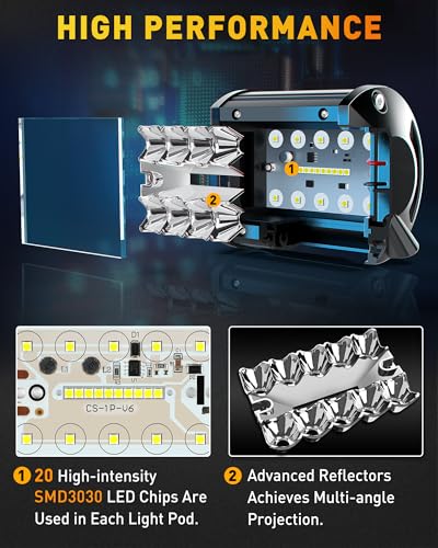 [Outstanding Performance] - The light pods kit adopts die-cast aluminum housing and advanced sealing technology, waterproof level reaches IP68, with a sturdy PC lens panel, which effectively resists variable and severe weather. Besides, 10 cooling fans are designed to dissipate heat efficiently. These features enhance the lifespan of the pod lights up to 50,000 Hrs. Providing reliable performance even in the most challenging environments.