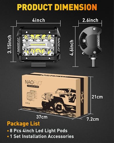 [High Brightness LED Light Bars] - NAOEVO 4-inch 8pcs light bar uses a total of 160 high-end SMD3030 LED chips (20pcs in each), achieving lighting effects of 480W/48000LM (total). Its bright and powerful 6500K white light easily defeats the darkness in front of you, ensuring you drive safely and efficiently!