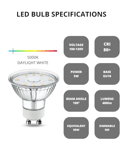 ?????Energy Efficient & Long Lasting? 5W GU10 LED bulbs replace 50W halogen bulbs, saving 90% on your electricity bill. With a lifespan of over 20,000 hours, they last 10 times longer than halogen and incandescent bulbs.