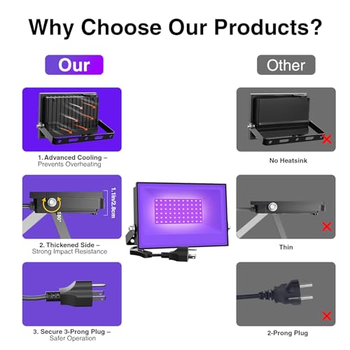 EFFICENT COOLING : This 38W black light flood light fixture is designed with a fin-type heat sink, which means it acts like a radiator to dissipate heat;