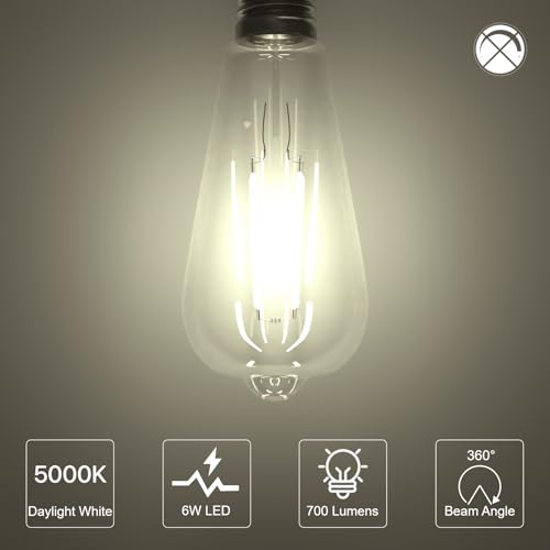 ORALUCE LED Edison Light Bulb 60 Watt Equivalent E26,Vintage Light Bulbs 6W 5000K Daylight White 700 Lumen, ST64 / ST21 Antique LED Filament for Ceiling Light Fixture, Non-dimmable, 6 Pack
