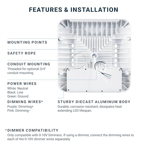 HIGH QUALITY. IP65 Waterproof rated and ETL-Listed. Constructed with a rugged, rust proof die-cast aluminum housing and finished with a UV stabilized powder coat paint, this product will be protected against fade and wear and maintain its durability over time. This product is built with Steady-Dim technology and is compatible with 0-10V dimmers. ETL-listed for optimal safety.