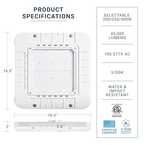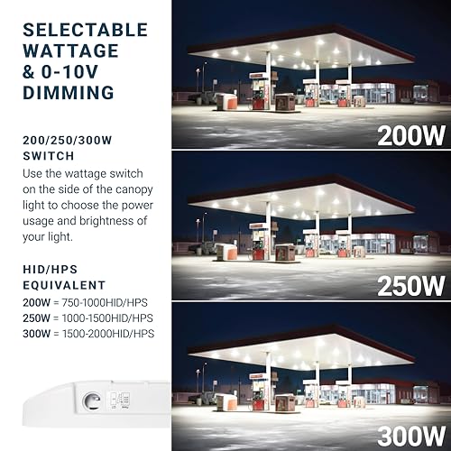 ? ENERGY EFFICIENT Use this 200W/250W/300W Wattage Selectable LED Canopy Light Fixture to replace 1000/1500/2000 HPS/HID and save on your electric bill. Avoid frequent bulb replacement when switching to this Wattage Selectable LED Canopy Light which has a lifetime of 50,000+ rated hours.
