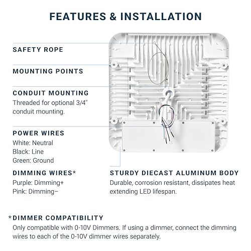 HIGH QUALITY. IP65 Waterproof rated and ETL-Listed. Constructed with a rugged, rust proof die-cast aluminum housing and finished with a UV stabilized powder coat paint, this product will be protected against fade and wear and maintain its durability over time. This product is built with Steady-Dim technology and is compatible with 0-10V dimmers. ETL-listed for optimal safety.
