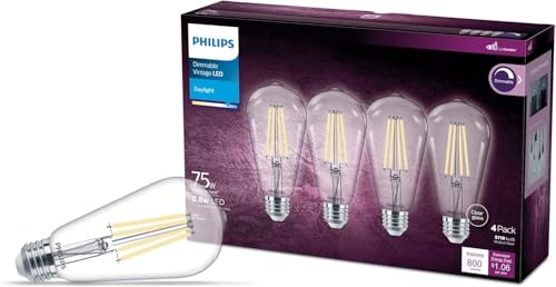Philips LED Vintage Flicker-Free Clear Spiral ST19 Bulb - Daylight (5000K) - 4 Pack - 8.8W=75W - 800 Lumen - E26 Base - Dimmable - Eye Comfort Technology