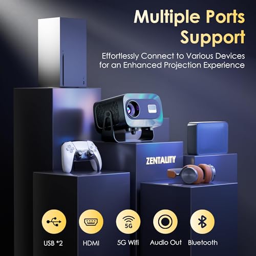 [Projector with WiFi 6 & Bluetooth 5.1] The ZENTALITY projector features dual-band 5G/2.4G WiFi 6 for ultra-fast, stable screen mirroring with no lag or frame drops. With Bluetooth 5.1, you can stream audio wirelessly either by using the projector as a standalone Bluetooth speaker or by pairing it with external speakers, headphones, or soundbars to elevate your home theater experience.NOTE: Bluetooth supports audio output only, not video transmission.